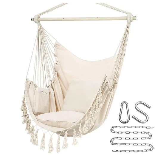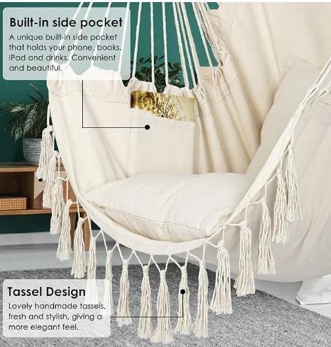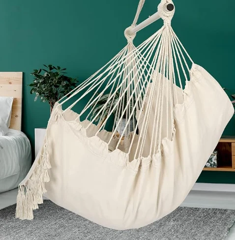 ການຫຍິບຫ້ອຍຫ້ອຍ hammuck. ຕິດຕັ້ງມັນໄດ້ທຸກເວລາ, ທຸກບ່ອນ. ພຽງແຕ່ຊອກຫາສາຂາ, beam ຫຼື hammock, ເກົ້າອີ້ swing ທີ່ດີສໍາລັບຜະລິດຕະພັນນອກຫຼືພາຍໃນ. ມັນເຫມາະສົມທີ່ສຸດສໍາລັບການນໍາໃຊ້ໃນຫ້ອງນອນ, ເປັນການຕົກແຕ່ງຫ້ອງ, ລະບຽງ, ເດີ່ນເຮືອນ, ແລະສວນ. ຖ້າທ່ານຕ້ອງການກັບຄືນ, ຢ່າເອົາແທັກອອກຈາກເກົ້າອີ້ swing