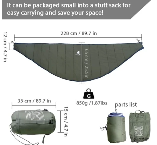 ຂະຫນາດ 3 - 4 ລະດູໃບ Hammock Quilt ແມ່ນເຫມາະສໍາລັບອຸນຫະພູມຈາກ 41 ° F ເຖິງ 68 ° F; ມັນມີຮູບຮ່າງທີ່ເຫມາະສົມທີ່ຈະພໍດີກັບຫ້ອຍຄ້ອນ, ເຊິ່ງປ້ອງກັນທ່ານຈາກລົມແລະເຮັດໃຫ້ທ່ານໄດ້ຄິດໃສ່ຢ່າງອົບອຸ່ນ.